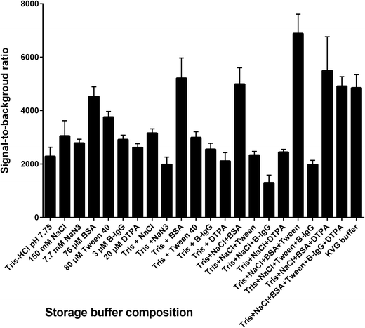 Component-by-component investigation of the storage buffer composition at concentration of 1.25 × 108 particles μL−1 and 1 mU L−1 of TSH. Mean values of three replicates are presented as bars and standard deviation as error bars. Impact of the storage buffer composition is measured by testing the assay performance (signal-to-background ratio) with the particles stored in the specified buffer and then diluted into KVG buffer. The best signal-to-background ratio was obtained with particles stored in 50 mmol L−1 Tris–HCl (pH 7.8), 150 mmol L−1 NaCl, 76 μmol L−1 bovine serum albumin, and 80 μmol L−1 Tween 40