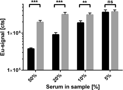 Affinity purification increases the sensitivity of the assay. We added (100 μU L−1) of TSH (Sample + 100 μU L−1) into female serum samples with low–normal range TSH (Sample) (approximately 0.4–1 mU L−1). TSH recovery was illustrated by plotting Eu-signal (Sample + 100 μU L−1) – Eu-signal (Sample). The serum samples were not purified (black) or affinity purified (gray) with Fab 5A10 anti-PSA antibodies that beared a resemblance to anti-TSH antibodies, but having no specific antigens in the serum. Addition was done in respect to total well volume, and thus all samples should have given the same Eu-signal. Differences between treated and untreated samples were tested with regular two-way ANOVA with Sidak’s test for multiple comparisons; ns p > 0.05, **p < 0.01, and ***p < 0.001