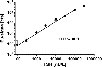 Good precision and accuracy are often problematic to achieve at the same time, and therefore small changes in trends cannot usually be detected in a number of diagnostic test formats. Hence, more powerful tools are required to quantitatively detect low concentrations of target analyte, small changes in concentrations, and trend reversals due to intervention therapy [19]. In plasma and serum the matrix-related interferences often hamper precise measurements, especially in the case of autoimmune disorders [20]. In this study we demonstrate the effects of our conceptual findings on the TSH immunoassay performance, and especially their potential to reduce matrix interference. Our optimized europium(III) nanoparticle labeling technology in sandwich-type immunoassays is shown to improve the LLD to 60 nU L−1, which equals 450 amol L−1 [21], and is 1/50 of the LLD obtainable by the current market leaders in TSH assays. The assay is based on 96 well-plate format, where Eu(III)-labeled nanoparticles are used as labels and time-resolved fluorescence is used to monitor TSH quantitatively from the surface of a reaction well.