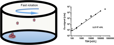 We were able to decrease the lowest limit of detection and increase sensitivity of TSH immunoassay using Eu(III)-nanoparticles. The improvement was achieved by decreasing binding time of nanoparticle bioconjugates by small capture area and fast circular rotation. Also, we applied a step to stabilize protein corona of the nanoparticles and a serum-preprocessing step with a structurally related antibody.