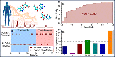 Separation of the studied nucleosides and the internal standard 8-Bromoguanosine by CE-UV (a); classification of the external validation samples (30 from healthy volunteers and 21 from prostate cancer patients) by the developed Partial Least Square – Discriminant Analysis (PLS-DA) model with accuracy of 82.4% (b); Receiver Operating Characteristics (ROC) curve (c); and Variable Importance in the Projection (VIP) values for the studied nucleosides (d). A significant down-regulation of 5- methyluridine (5mU) and inosine (I) was observed, which can be indicative of the presence of prostate tumors.