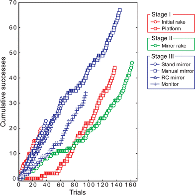 As shown in Fig. 2, the RC mirror was mastered faster than the manual mirror (61 and 145 trials, respectively), suggesting that competence with the manual mirror transferred effectively to the novel apparatus. The monitor took longer to master than the stand mirror (96 vs. 39 trials, respectively). In sum, in this stage the monkey used a variety of mirroring tools to locate and guide its reaching for food (Supplementary videos S2–S5). It took 9 days in total to finish all steps in Stage III.