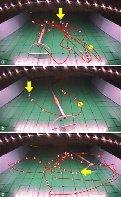 Representative trajectories of M1’s camera rake after food has been placed (a, b) and after sham placement (c), during early (a) and late (b, c) phases of Stage IV. The camera was fixed at the center of the table and faced the monkey from a distance of 70 cm. The video capture rate was 30 frames/s. Yellow arrows starting point of rake. Yellow circles (a, c) food position. Red circles center of camera rake tip every 1/3 s (every 10th frame). a Early in the training, the monkey just pushed and pulled the rake back and forth repeatedly until it retrieved the food by chance. The whole process took 5.6 s. b Later in the training, M1 began to make arcing trajectories with the rake. When the food was put on the table, he searched actively with the camera rake and retrieved the food very efficiently, in just 1.5 s. c When no food was present, the monkey searched the entire surface of the table repeatedly with the rake before giving up. The amount of time spent searching before giving up varied, but usually lasted longer than 10 s. In this instance it lasted 7.5 s