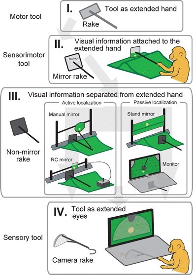 The training structure for acquisition of a sensory tool. The training was divided into four Stages (I–IV), and the tool used in each stage is depicted on the left. (I) Rake, as a motor tool, to retrieve food on a flat table. Platform was used to train the monkey to raise the rake. (II) Mirror rake, as a sensorimotor tool, to retrieve food hidden behind a hump. To locate the food, the monkey had to use the food’s reflection in the mirrored tip of the rake. (III) Non-mirror rake, the same shape as the mirror rake, on a humped table. The rake could be used to retrieve food, but could no longer be used to locate it. There were two lines of training for mastering the use of visually displaced cues. In case of the manual mirror and remote-controlled (RC) mirror, the animal actively operated the tools to search for the food. In case of the stand mirror and the monitor, he passively observed the captured image of the hidden food. (IV) Camera rake, as a sensory tool, with a transparent tip and a forward-facing camera mounted in the handle. Because of the opaque screen, the monkey had only the captured image on the monitor to guide its searching and retrieval