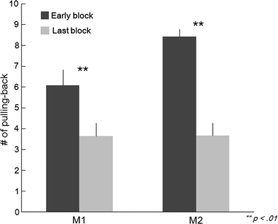 The number of “pulling-back” the camera rake in the early (dark grey bar) and the last (light grey bar) blocks in Stage IV. The scores are averaged for 100 trials, depicted with standard errors. “Pulling-back” the rake was defined as moving the rake tip more than 25 cm vertically to the monkey’s side, after he started searching for food at the beginning of each trial. The numbers were counted until 600 trials in M1 and 1,100 trials in M2, at which they showed smooth and circular movement of the rake to retrieve the food. The data of the early and the last blocks were obtained from the first and sixth blocks in M1, whereas they were in the second and eleventh blocks from M2