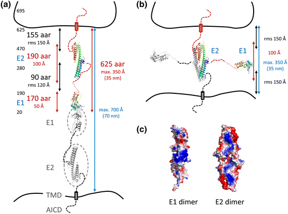 APP/APLP trans-dimerization. a Schematic illustration of the E1 domain-mediated APP dimer spanning intercellular space between, e.g., pre- and postsynaptic sites (APP695 numbering, aar amino acid residue). Structures of E1 [protein data bank (PDB) code 3KTM] and E2 (PDB code 1RW6) are shown as rainbow colored ribbons (blue to red: N- to C-terminus). E1 domain-mediated dimerization with a second APP molecule (gray subunit) is based on structural data of the E1 domain according to the PDB code 3KTM. Gray circles illustrate the positions of E1 and E2 domain in the APP structure. Sizes of unknown linker regions are estimated based on random coil geometry [rms root mean square, average end-to-end distance of a random coil polypeptide (Creighton 1993)]. b E2 domain-mediated APP dimer based on 1RW6. The estimated maximal length of the dimer is about half of the E1 dimer. Notably, taking available SAXS data into account, calculated rms distances might overestimate the maximal distance spanned by an APP trans-dimer under physiological conditions. c Surface potentials of the E1 and E2 dimers (blue positively charged, red negatively charged). Both dimers form continuous positively charged surface patches favorable for HSPG binding