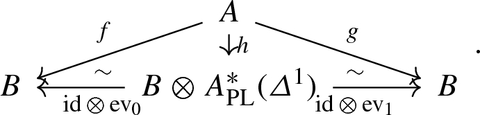 , and two projections \({{\mathrm{ev}}}_{0}, {{\mathrm{ev}}}_{1} : A_{\mathrm {PL}}^{*}(\varDelta ^{1}) \xrightarrow {\sim } {\mathbb {R}}\) given by setting \(t = 0\) or \(t = 1\). Two morphisms \(f,g : A \rightarrow B\) with cofibrant source are homotopic if there exists a homotopy \(h : A \rightarrow B \otimes A_{\mathrm {PL}}^{*}(\varDelta ^{1})\) such that the following diagram commutes: Many of the CDGAs that appear in this paper are \({\mathbb {Z}}\)-graded. However, to deserve the name “model of X”, a CDGA should be connected to \(A_{\mathrm {PL}}^{*}(X)\) only by \({\mathbb {N}}\)-graded CDGAs. The next proposition shows that considering this larger category does not change our statement.