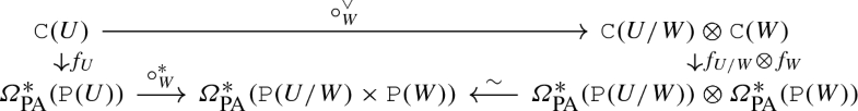 To multiply an element of \(\texttt {C}(U \sqcup I) \subset {{\mathrm{Tw}}}\texttt {C}(U)\) with an element of \(\texttt {C}(U \sqcup J) \subset {{\mathrm{Tw}}}\texttt {C}(U)\), we use the maps \(\texttt {C}(V) \xrightarrow {\circ _{\varnothing }^{\vee }} \texttt {C}(V / \varnothing ) \otimes \texttt {C}(\varnothing ) \cong \texttt {C}(V \sqcup \{*\})\) iterated several times, to obtain elements in \(\texttt {C}(U \sqcup I \sqcup J)\) and the product. \(\square \)