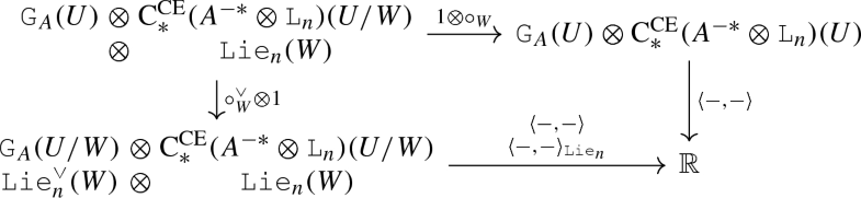 On the factor \({\texttt {e}_{n}^{\vee }}(U) \otimes \bigotimes _{i=1}^{r} \texttt {Lie}_{n}(U_{i})\), it uses the duality pairing on \({\texttt {e}_{n}^{\vee }}(U) \otimes \texttt {e}_{n}(U)\) (recalling that \(\texttt {e}_{n} = \texttt {Com}\circ \texttt {Lie}_{n}\) so that we can view \(\bigotimes _{i=1}^{r} \texttt {Lie}_{n}(U_{i})\) as a submodule of \(\texttt {e}_{n}(U)\)).