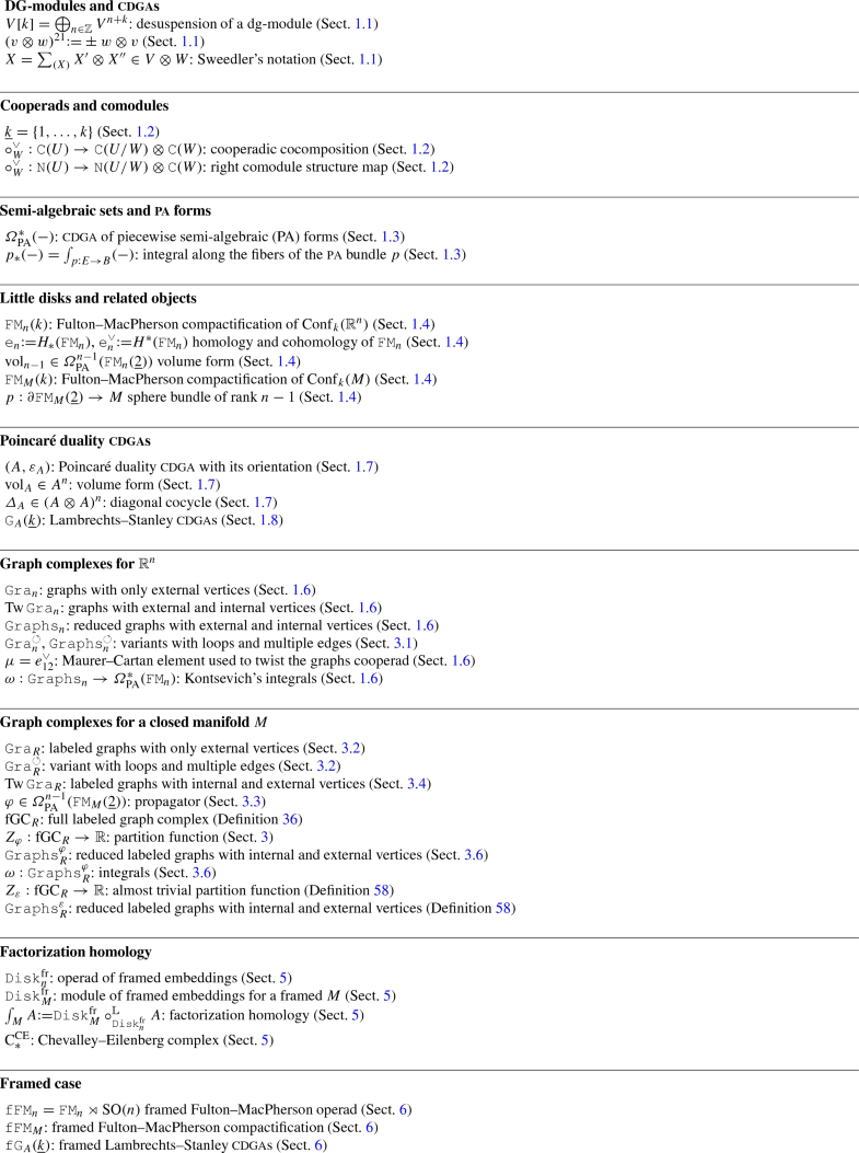 Roadmap. In Sect. 1, we lay out our conventions and recall the necessary background. This includes dg-modules and CDGAs, (co)operads and their (co)modules, semi-algebraic sets and PA forms. We also recall basic results on the Fulton–MacPherson compactifications of configuration spaces \(\texttt {FM}_{n}(k)\) and \(\texttt {FM}_{M}(k)\), and the main ideas of Kontsevich’s proof of the formality of the little disks operads using the CDGAs of PA forms on the spaces \(\texttt {FM}_{n}(k)\). We use the formalism of operadic twisting, which we recall, to deal with signs more easily. Finally, we recollect the necessary background on Poincaré duality CDGAs and the Lambrechts–Stanley CDGAs. In Sect. 2, we build out of the Lambrechts–Stanley CDGAs a Hopf right \({\texttt {e}_{n}^{\vee }}\)-comodule \(\texttt {G}_{A}\).