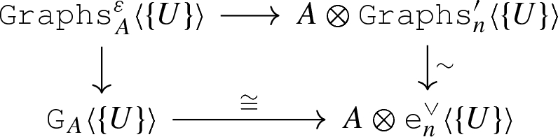We outline this proof here as we will mimic its pattern for our theorem. The idea of the proof is to construct a Hopf cooperad \(\texttt {Graphs}_{n}\). The elements of \(\texttt {Graphs}_{n}\) are formal linear combinations of special kinds of graphs, with two types of vertices, numbered “external” vertices and unnumbered “internal” vertices. The differential is defined combinatorially by edge contraction. It is built in such a way that there exists a zigzag \({\texttt {e}_{n}^{\vee }}\xleftarrow {\sim } \texttt {Graphs}_{n} \xrightarrow {\sim } \varOmega _{\mathrm {PA}}^{*}(\texttt {FM}_{n})\). The first map is the quotient by the ideal of graphs containing internal vertices. The second map is defined using integrals along fibers of the PA bundles \(\texttt {FM}_{n}(U \sqcup I) \rightarrow \texttt {FM}_{n}(U)\) which forget some points in the configuration. An induction argument shows that the first map is a quasi-isomorphism, and the second map is easily seen to be surjective on cohomology.