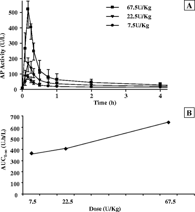Evaluation of the pharmacokinetics of exogenous AP in humans is complex because the enzyme is also produced endogenously and the activities of endogenous and exogenous enzymes are indistinguishable. We corrected enzyme values for pre-dosing activity, although this does not completely exclude interference from endogenous variations due to circadian and food influences. We controlled endogenous interference in volunteers through fasting, bearing in mind that it is impossible to totally abolish interference from endogenous enzyme physiologically or in pathology. Therefore, while Cmax and AUC of short infusions with low doses of AP showed linearity of enzyme activity in relation to dosing, short infusions were poor predictors of elimination and clearance during long infusions. Nevertheless, the linearity and dose-proportionality of AUCs after administration of ascending doses of exogenous enzyme demonstrate that the AUC is related to exogenous enzyme administration.