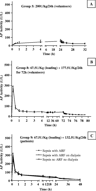 Samples at three time-points post-treatment (4, 8, 24 h) were collected for estimation of whether elimination t1/2 had been achieved at these points, defined as activity level ≤50% of mean activity at 18–24 h infusion. Elimination t1/2 was ≤4 h for one patient, 4–8 h for six patients, and slightly longer than 8 h for four patients, similar to volunteers in groups 5 and 8 who had received ≥24 h infusion and for whom we had robust elimination data. Regardless of the parameter, the patient data did not suggest that the pharmacokinetics of exogenous AP is affected in any appreciable manner by the profound metabolic abnormalities that accompany severe sepsis, whether or not patients sustained acute renal failure or received RRT.