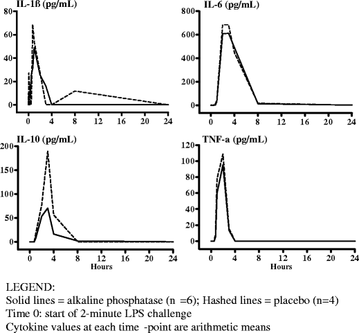 Changes in cytokines after LPS challenge (group 7). Solid lines indicate alkaline phosphatase (n = 6); hashed lines indicate placebo (n = 4). Time 0 is the start of 2-min LPS challenge. Cytokine values at each time point are arithmetic means