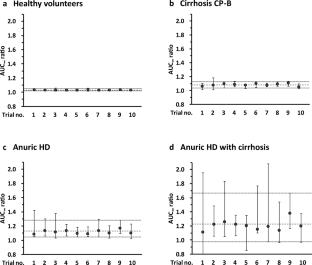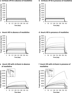 The predicted DDI effect of mexiletine was negligible or weak in anuric hemodialysis with cirrhosis population (mean [5th/95th percentiles], 1.23 [0.97–1.67]), although it was negligible in healthy volunteers (1.03 [1.02–1.05]). The predicted flecainide concentrations after multiple flecainide doses (50 mg BID) in the anuric hemodialysis with cirrhosis population were comparable with the observed value (3602 ng/mL), which fell between the predicted concentrations in the absence and presence of mexiletine (3043 [718–8499] and 5914 [880–20,624] ng/mL, respectively).