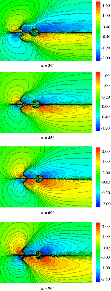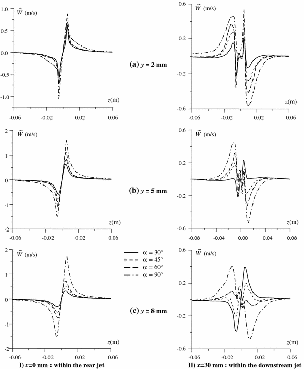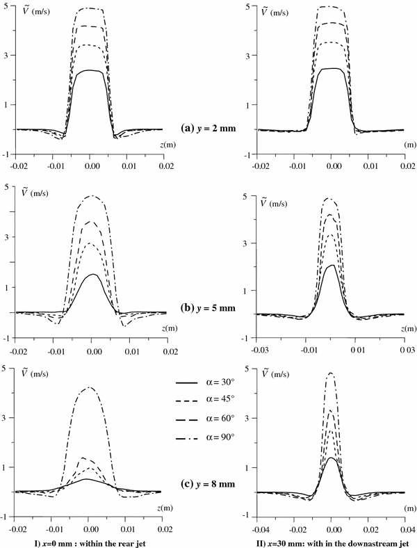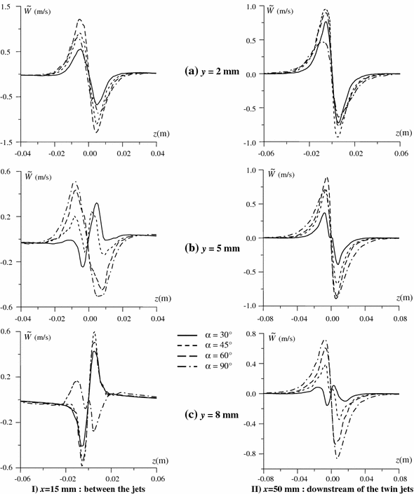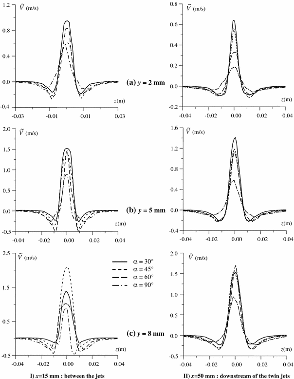 Being located within the second jet nozzle brings a significant change on the distribution of the lateral velocity component. It consists in the development of two further peaks of opposite signs and located on both sides of the already present ones. These supplementary peaks clearly express the presence of the double jet since the interior peaks correspond to the second jet emission whereas those located on the periphery correspond to the extension of the reverse flow trapped between the twin jets’ columns (Fig. 10). The passage to a higher plane (y = 5 mm), brings changes on the development of the internal and external peaks. In fact, whereas the highest internal peaks are reached with the highest inclination angle on the first plane, this order is completely inversed in the current plane since the highest peaks correspond to the weakest angle. Furthermore, we note the disappearing of the periphery peaks under the weakest inclination case.