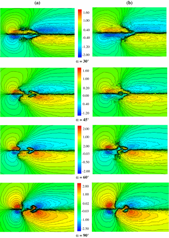 Spanwise velocity contours on two different vertical planes under the different inclination cases: a y = 5 mm and b y = 8 mm