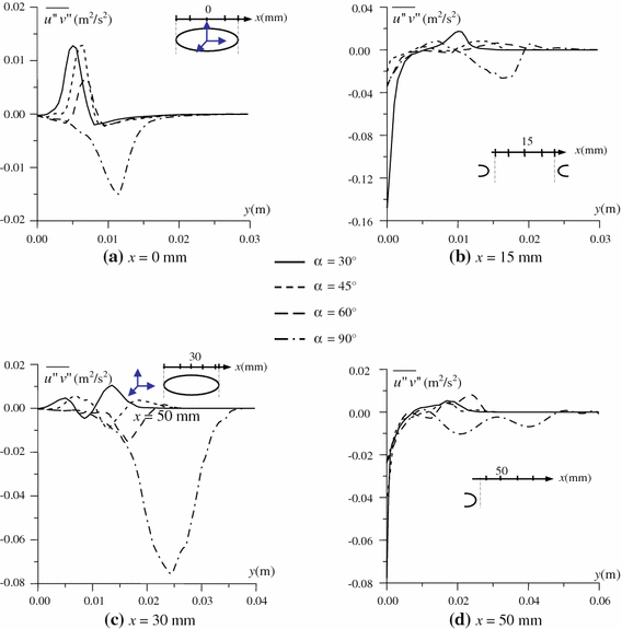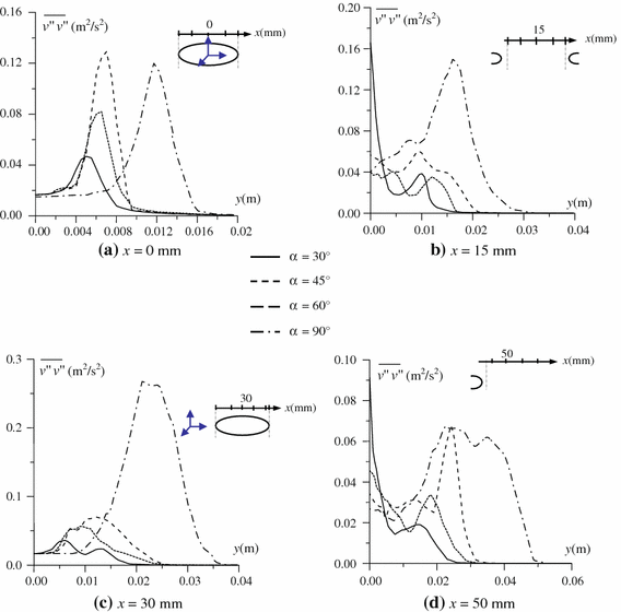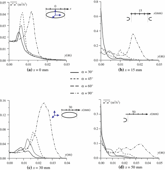 A global sight to the different distributions reveals, before any deep examination, that the more distinct stress peaks are depicted within the twin jets’ columns; which does not automatically mean higher stress values. This region is in fact an interaction zone between the twin jets themselves and between the jets and the oncoming crossflow. If the \( \overline{u''u''} \) stress attains its maximum in this zone it is simply because it shields a high interaction activity indicating a maximum turbulence and subsequent diffusion production and. We propose to examine more closely all these variations and to begin let us consider the first jet location (Fig. 13a) where all the profiles share the same initial value that is contained in the first jet “background”. Once the upstream jet is emitted, we assist to the establishment of a single peak that is attained farther as the jets are straightened and whose magnitude goes increasing with the initial inclination angle. This increasing is logic since straightening the jets provides them with a higher impulse allowing them to cross the oncoming mainstream deeper before undergoing its deflecting process. The development of this peak is then simply generated by the interaction of the rear jet with the crossflow and its resistance to the deflection the latter experiences on it. Within the downstream jet location (Fig. 13c), the peaks are rather registered farther from the injection plate (y > 10 mm). In fact, due to the shielding effect of the rear jet, the second one is likely to progress deeper in the domain before being deflected. The turbulent activity which is engendered by the interaction of the emitted jets and the environing flow is consequently delayed which justifies the later peaks registration. It is further delayed as the jets are straightened due to their farther emission within the domain (increasing y coordinates).