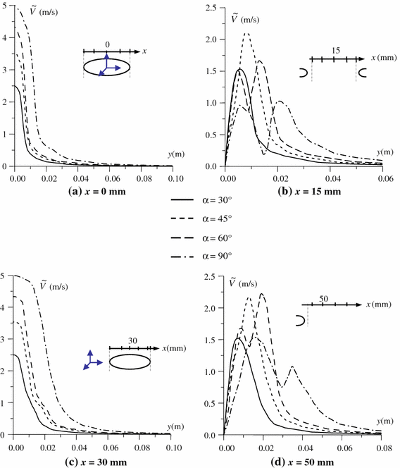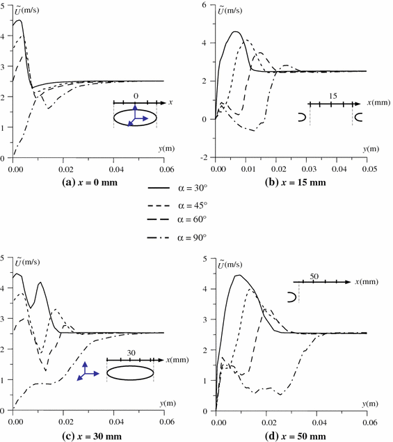 When we are located within the first jet nozzle (Fig. 4a), we note that the augmentation of the initial inclination affects essentially the initial value of the longitudinal velocity by reducing it progressively till it becomes null although we are inside the jet’s core; the least situation happens in the case of a normal injection (cosα = 0 when α = 90°). These observations lead us to suppose that increasing the initial transverse inclination tends to straighten the jets favoring rather a vertical (toward the y coordinates) expansion than a longitudinal one (x). Farther downstream, the profiles join together around a unique velocity value: the uniform velocity of the transverse flow. At that moment (in the vicinity of y = 50 mm), we join the surrounding flow that stayed outside the interaction zone whose velocity is U ∞ = 2.5 m/s.