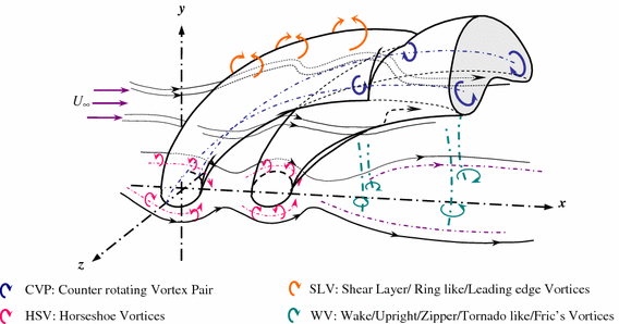 As long as the jets emerge and penetrate through the mainstream, the jets’ plumes are deflected, rolled up and skewed resulting in the formation of jet shear layer vortices (SLV) (Fig. 2b) also known as leading edge or ring like vortices. These are quasi-steady vortices that take place in the interface between the front surface of the twin jets and the oncoming crossflow as a result of the Kelvin–Helmholtz instability of the annular shear layer that separates from the edge of the injector. Kelso et al. [14] report that the shear layer rollup is limited to the upstream side of the jet for smaller Re, while for crossflow Reynolds numbers higher than 1,000, large scale roll up occurs along the entire perimeter of the shear layer. These structures are analogous to the vortex ring structures typically observed in free jets. The SLV may also turn and realign itself in the streamwise direction due to the momentum of the oncoming crossflow.