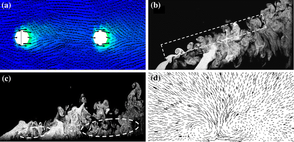 Visualization of the different established vortices along the domain: a Horseshoe vortices, b shear layer vortices, c wake vortices, d counter rotating vortex pair. a and d are obtained numerically, and b and c are obtained experimentally for R = 1.29, α = 60° and D = 3d