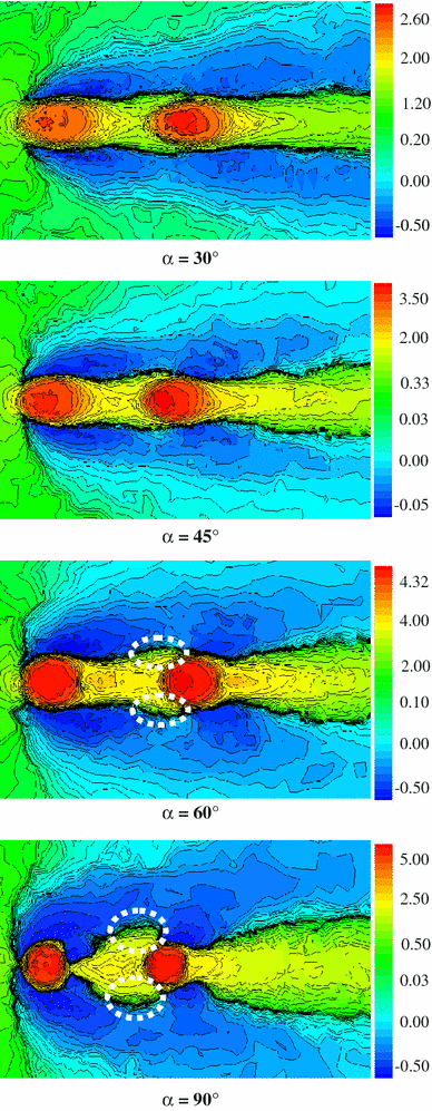 Finally when the jets’ respective plumes join, a counter rotating vortex pair (CVP) appears in the mean flow (Fig. 2d); they have already appeared in the separated plumes but become more significant when they develop in the resulting plume. This vortex results from the bending of the jets in the streamwise direction and represents the most robust flow feature over all parameter ranges; that is why it has been a subject of numerous studies in the particular case of a single jet in crossflow [14, 16, 17, 18]. Though the CVP is present in the mean flow, it has significant unsteady components [19] and its instantaneous structure may be strongly asymmetric (Smith and Mungal [20]). The mechanism of the CVP’s formation is not yet fully understood in a single jet in crossflow’s configuration and even less in that of double jets in crossflow. Some authors have, however, tried to explain it in a two dimensional model of a single jet in crossflow like Muppidi and Mahesh [21] who stated that the deformation of the jet cross section can be explained in terms of the pressure field around the jet, and of the initial acceleration that the jet fluid experiences in the direction of the cross-flow. They also explained the experimentally observed dependence of the CVP formation on the velocity ratio with the jet acceleration dependence on the cross-flow velocity. Which is certain is that the CVP originates at the side-walls of the jets. As it is generally accepted that the jets’ shear layers fold and roll up very near to the pipes exits, leading to or contributing to the formation of the CVP, although there are still remaining questions related to the nature of vortex roll up just at the nozzles’ exits. It has also been stated that the tilting and the folding of the vortical structures significantly contribute to the downstream components of the vorticity which leads, on an averaged basis, to the formation of counter-rotating vortical structures. All this concern toward the origin and development of CVP is justified by its ability of controlling vorticity generation and evolution and then of controlling transverse jet mixing and, potentially, reaction processes.