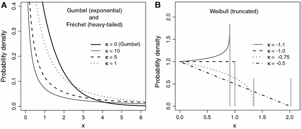 The GPD has been widely applied to problems in engineering and finance, but is not commonly encountered in biological applications (but see Orr 2006). Much of the statistical theory concerning the GPD involves asymptotic results that describe approximations to the distribution of the maximum likelihood estimator (MLE) which are valid for large sample sizes. To obtain these results, it is necessary to restrict the range of the parameter space. For example, the statistical literature on the estimation of the parameters of the GPD generally ignores the case of κ < −1/2, since for −1 ≤ κ < −1/2 asymptotic properties do not obtain, and for κ < −1, the MLE does not exist (Castillo and Hadi 1997). However, these restrictions are artificial and are made only for mathematical convenience. In applying the test of Beisel et al. (2007) to our data, we found that \( \hat{\kappa } = - 1 \) (see Results), but as part of the testing procedure, it was necessary to restrict κ ≥ −1, suggesting that the true value of κ could potentially be less than −1. Thus, to address parameter estimation for values in this range, we derived a simple procedure for estimating κ for values near −1.