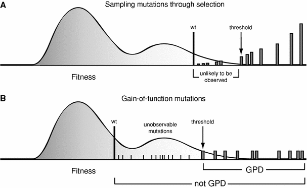 Two methods of sampling beneficial mutations. The shaded curve represents a hypothetical fitness distribution, and the vertical gray bars represent a sample of beneficial mutations. The locations of the vertical bars on the horizontal axis represent their fitnesses, and their heights represent their hypothetical relative probabilities of being observed in a single experiment under the sampling strategy. Note that only the fitnesses, and not their probabilities of being observed, are considered in the test. (a) Under selection, the wild type fitness lies in the tail but sampling is biased toward large-effect mutations. Repeated sampling will yield multiple observations of the same mutations, though those of very small effect may not be observed in a reasonable number of replicates. Shifting alleviates the bias due to missing very small-effect mutations. (b) In gain-of-function experiments, the wild type fitness will not lie in the tail and may in fact be zero, and some beneficial mutations may not have effects large enough to be observed. Mutations with effects above some threshold will have equal probabilities of being sampled, and as these are the fittest mutations, they will lie in the tail. The fitness of the smallest-effect mutation from those sampled provides a threshold in the tail of the distribution