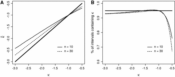 Performance of this new estimation procedure was assessed through simulations using R (R Development Core Team 2006). We used sample sizes of 10 and 30, and considered \( - 3 \le \kappa \le - 1/2 \) with right truncation point \( \lambda = - \tau /\kappa = 10 \). For each combination of sample size and κ, we generated 100,000 samples from the GPD and calculated \( \hat{\kappa } \) and its 95% confidence interval.