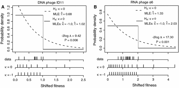 In applying the LRT, it is necessary to restrict κ ≥ −1, since for κ < −1, the likelihood can become infinite, and thus the maximum likelihood estimates do not exist. This restriction makes the test conservative, yet the fact that \( \hat{\kappa } \approx - 1 \) suggests that the best estimate of κ is ≤ 1. We developed a novel estimation method appropriate for κ near −1, which also provides confidence intervals (Materials and Methods). Applying this method with the threshold set as the fitness of the smallest-effect mutation, we estimated \( \hat{\kappa } = - 1.06 \) (ID11; 95% CI, −2.64 < κ < −0.57) and \( \hat{\kappa } = - 1.00 \) (ϕ6; 95% CI, −1.83 < κ < −0.63), in close agreement with the results from the LRT (Table 3). These confidence intervals encompass a wide range of tail behaviors (see Fig. 1), yet all are characterized by a right-truncated distribution and differ substantially from the exponential distribution.