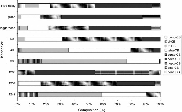 Percent composition of PCB congeners in loggerhead, green, and olive ridley turtles. Also presented are the compositions of two commercial PCB mixtures