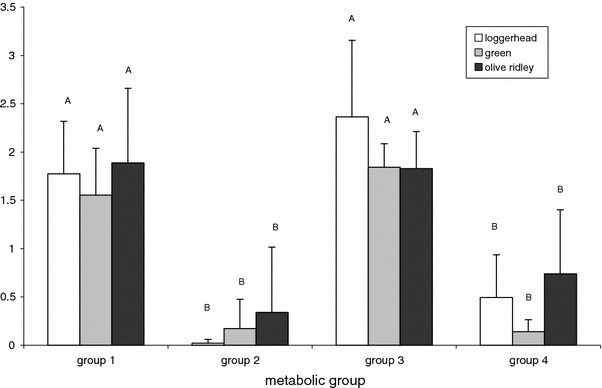 Sum contribution of PCBs (molar X/PCB 153) metabolic groups for loggerhead (white bars), green (gray bars), and olive ridley (black bars) turtles. Error bar indicates standard deviation. Different letters indicate significant difference within species (p < 0.05)