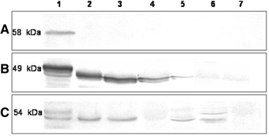 Representative Western blots of microsomal a CYP1A, b CYP2K1, and c CYP3A27 proteins for rainbow trout positive control (lane 1), green (lanes 2, 3), loggerhead (lanes 4, 5), and olive ridley turtles (lanes 6, 7)
