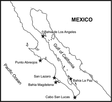 A map of the Baja California peninsula. Stars indicate sampling locations