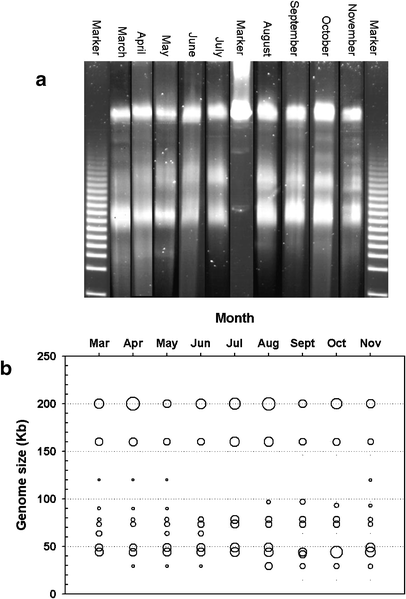 a PFGE gel of viral population, b and bubble plot representation of PFGE gel. Viral richness was determined using samples pooled per month for the study period. Day when samples were taken from experiment is indicated on x-axis; M, marker. Bubble position indicates position PFGE band and corresponding genome size, bubble size indicates relative band intensity. The DNA standards used in the PFGE were a 5 kb and a λ marker