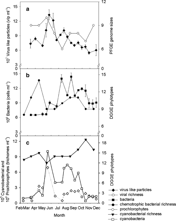 Viral, bacterial and cyanobacterial abundances and richness over the study period. a Number of viral genome sizes per month observed with PFGE and viral abundances. b Number of heterotrophic bacterial DGGE phylotypes (DGGE bands) observed per month and bacterial abundances. c Number of cyanobacterial DGGE phylotypes observed per month and cyanobacterial abundances. The flow cytometric cyanobacterial counts are split up in the phycocyanin-containing filamentous cyanobacterial species (cyanobacterial) and filamentous cyanobacteria not containing phycocyanin (prochlorophytes). Error bars show standard deviation (n = 3)