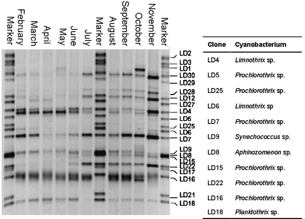 The product of both the bacteria and cyanobacteria-specific PCR procedure is a GC clamp containing PCR product of approximately 200-bp long. This product was subjected to DGGE using a clone ladder composed of 23 previously sequenced and described Lake Loosdrecht clones. Of these clones, 11 are of cyanobacterial origin [61, 62]. This procedure enables to directly compare the cyanobacterial community profiles with those of the total bacterial community and was optimized using Lake Loosdrecht water [63].