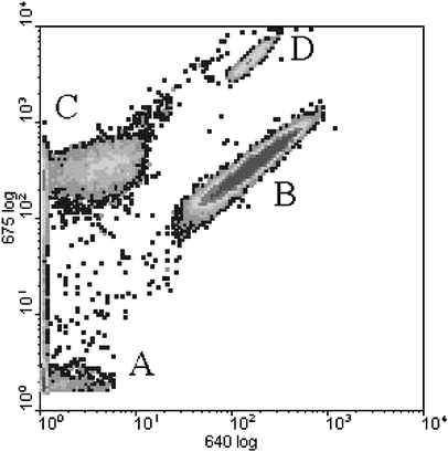 Phytoplankton clusters in typical Lake Loosdrecht sample as detected by flow cytometry. (A) bacteria/detritus cluster (B) cyanobacterial cluster (C) prochlorophyte cluster (D) algal cluster