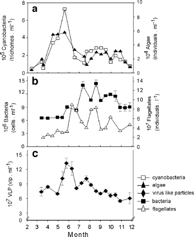 Algal, cyanobacterial, bacterial, nanoflagellate, and viral abundances during the study period. White squares, black triangles, black squares, white triangles and black rhombus represent cyanobacteria, algae, bacteria, nanoflagellates and virus like particles, respectively. a Flow cytometric counts of total cyanobacterial (including prochlorophytes) and algal communities. b Epifluorescence microscopic counts of heterotrophic bacterial community and light-microscopic counts of nanoflagellate community. c Epifluorescence microscopic counts of viral abundances. Error bars show standard deviation (n = 3)