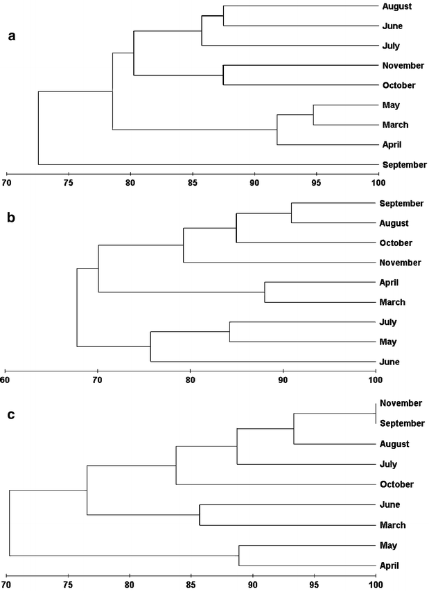 Similarity analysis of the viral, bacterial and cyanobacterial community profiles. All dendrograms were constructed using group-average linking. Bray-Curtis similarity matrices were obtained based on presence–absence analysis of bands. a Dendrogram showing degree of similarity between viral community profiles of the different months based on PFGE analysis. b Dendrogram showing degree of similarity between heterotrophic bacterial community profiles of the different months based on DGGE analysis. c Dendrogram showing degree of similarity between cyanobacterial community profiles of the different months based on DGGE analysis