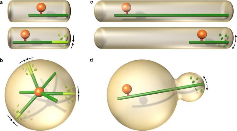 Pushing versus pulling. The positioning mechanisms based on microtubule pushing are efficient for movements over small distances (a), and for centering in symmetric geometries (b). Mechanisms based on pulling are preferred in cases where the distances to be covered by the organelles are large (c), and where the geometry is asymmetric and complex (d)