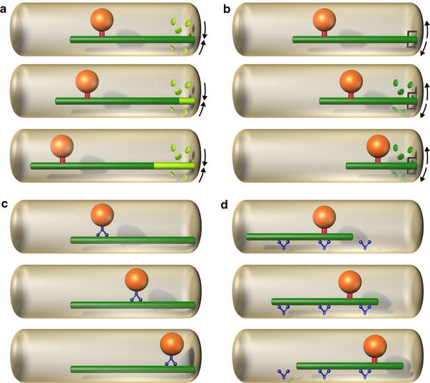 Basic types of microtubule force generation. a Pushing, b pulling; c, d sliding. a, b The organelle (orange) is bound to the microtubule (green) by a fixed link (red). a The organelle is being pushed away from the cell edge by a microtubule polymerization force. The microtubule polymerizes by addition of new subunits (light green discs) at its end (arrows). b A depolymerizing microtubule, which is connected to the cell edge by an active motor or a passive “adaptor” (dark grey), is pulling the organelle towards the cell edge. Depolymerization is accompanied by a loss of old subunits (dark green discs and arrows). c A motor protein (blue) walks along the microtubule and carries the organelle. d Motor proteins (blue) are anchored at the cell cortex and walk along the microtubule, thus translating the microtubule together with the bound organelle