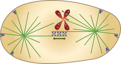 The mitotic spindle. Microtubules (green) form two asters and the central spindle, where the microtubules growing from the two spindle poles meet. Microtubule “plus-ends” (the more dynamic ends) are in the center of the spindle and at the cell periphery, while the “minus-ends” (the less dynamic ends) are anchored at the spindle poles. Motor proteins (blue, at the cell center) cross-link the overlapping anti-parallel microtubules in the central spindle and slide them past each other. Chromosomes (red; only one is shown for clarity) are attached to microtubules at the kinetochore (yellow), where forces towards and away from the spindle pole are generated. Chromokinesins (grey) reside at the chromosome arms and push the chromosomes away from the spindle pole by walking towards the microtubule plus-end. Minus-end directed motors (blue, at the cell periphery) are anchored at the cell cortex and pull on astral microtubules, thereby elongating the spindle