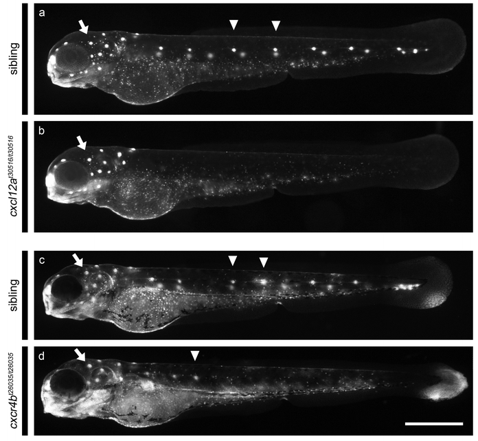 (a-d) DiOC6 stains of 3 dpf of cxcl12a t30516/t30516 (b) and cxcr4b t26035/t26035 (d) mutant larvae and their respective siblings (a and c) showing the location of posterior lateral line neuromasts (arrowheads). Both cxcl12a t30516/t30516 (b) and cxcr4b t26035/t26035 (d) mutant larvae lack or show decreased number of neuromasts in the trunk and the tail compared to their siblings (a and c, respectively). Note that neuromasts in the anterior lateral line (arrows) remain unaffected in mutant larvae (b and d). Scale bar, 500 μm. (GIF 241 kb)