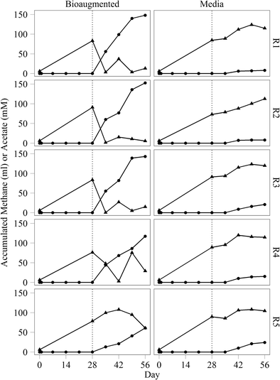 Accumulated methane (circle) and acetate (triangle) in digestate from bioaugmented and media control reactors R1–R5. Digesters were treated with either an acetoclastic consortium or sterile medium on day 28 (indicated by the dotted line)