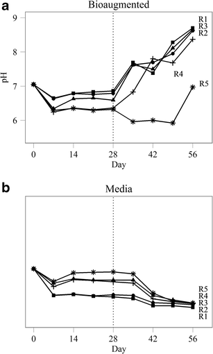 Digestate pH in bioaugmented (a) and media control (b) reactors R1–R5. Digesters were treated with either an acetoclastic consortium or sterile medium on day 28 (indicated by the dotted line)
