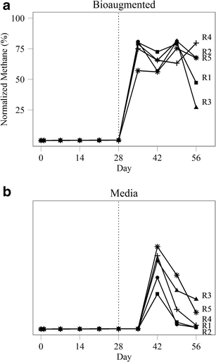 Normalized methane as a percentage of total biogas produced in bioaugmented and media control reactors R1–R5. Digesters were treated with either an acetoclastic consortium or sterile medium on day 28 (indicated by the dotted line)