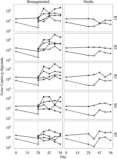 Gene abundances of bacterial cpn60 for OTU1109 (circle) and OTU2923 (triangle), and archaeal thermosome for OTU805 (cross) and OTU795 (square) in the digestate of bioaugmented and media control reactors R1–R5. OTU2923 and OTU795 were only detected after bioaugmentation treatment. Digesters were treated with either an acetoclastic consortium or sterile medium on day 28 (indicated by the dotted line)