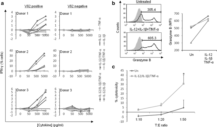 IL-12, IL-1β and TNF-α induce γδ T-cell IFN-γ production and cytotoxicity. a γδ T-cells were cultured overnight with different concentrations and combinations of IL-12, IL-1β and TNF-α prior to measuring IFN-γ expression on gated Vδ2+ and Vδ2− cells. Individual experiments from three donors are shown. b MFIs for granzyme B expression on gated γδ T-cells after overnight culture with 10 ng/ml each of IL-12, IL-1β and TNF-α. Left: Representative flow cytometric histogram plots from one donor. Black fill is the isotype control antibody. Numbers are MFIs within the marker shown. Right: MFI values for n = 3. c Cytokine-activated γδ T-cells were co-cultured overnight with Daudi cells at the target (T) to effector (E) cell ratios shown. Cytotoxicity was assessed by measuring lactate dehydrogenase release into the culture supernatants. Mean values for n = 3 (T:E 1:50) and n = 2 (T:E 1:10 and 1:20) are shown. Untreated (un) cells were used as a negative control throughout. Error bars represent SD deviations and * indicates a P value of <0.05 for paired t tests between treatments at the T:E ratio of 1:50