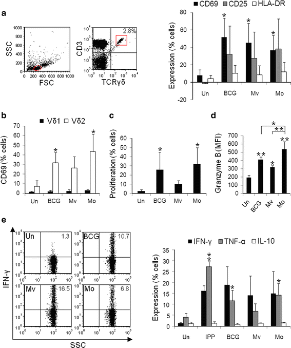 γδ T-cells within BCG-, M. vaccae- and M. obuense-treated PBMCs produce granzyme B and TH1 cytokines. PBMCs were cultured with heat-killed BCG, M. vaccae (Mv) and M. obuense (Mo) and responses measured within gated γδ T-cells. Untreated (un) cells were used as a negative control. a Gating strategy used to identify γδ T-cells within PBMCs. Lymphocytes were gated according to size (forward scatter; FSC) and granularity (side scatter; SSC). Within lymphocytes, γδ T-cells were gated as CD3+TCRγδ+. Mean percentages of γδ T-cells expressing CD69 (at 24 h; n = 5), CD25 and HLA-DR (both at 48 h; n = 3) are shown. b Mean percentages of Vδ1+ and Vδ2+ cells expressing CD69 (at 24 h; n = 3). c CFSE+ PBMCs were cultured for 6 days with mycobacteria and proliferation measured within the γδ T-cell compartment. Mean percentages of γδ T-cells proliferating are shown (n = 6). d Mean fluorescent intensities (MFI) of granzyme B expression within γδ T-cells (at 24 h; n = 3). e Percentages of γδ T-cells expressing IFN-γ, TNF-α and IL-10 were measured after 24 h of stimulation. Representative flow cytometric dot plots from one donor and mean values for n = 3 are shown. Error bars represent SD. * and ** indicates P values of <0.05 and <0.001, respectively, for statistical comparisons between treated and untreated cells